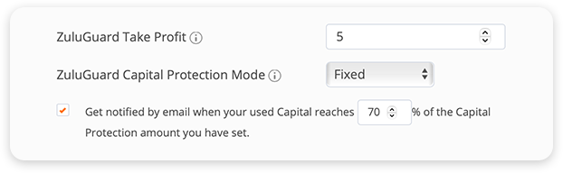 Pongamos por ejemplo que configure la Protección de Capital del ZuluGuard a $1500 y opte por recibir una notificación al 50%. Si el capital utilizado por el Trader llega al 50% (- $750) de la cantidad configurada a la Protección de Capital ($1500), usted recibirá un correo electrónico que le invitará a vigilar de cerca su cuenta y las configuraciones del ZuluGuard para este Trader.